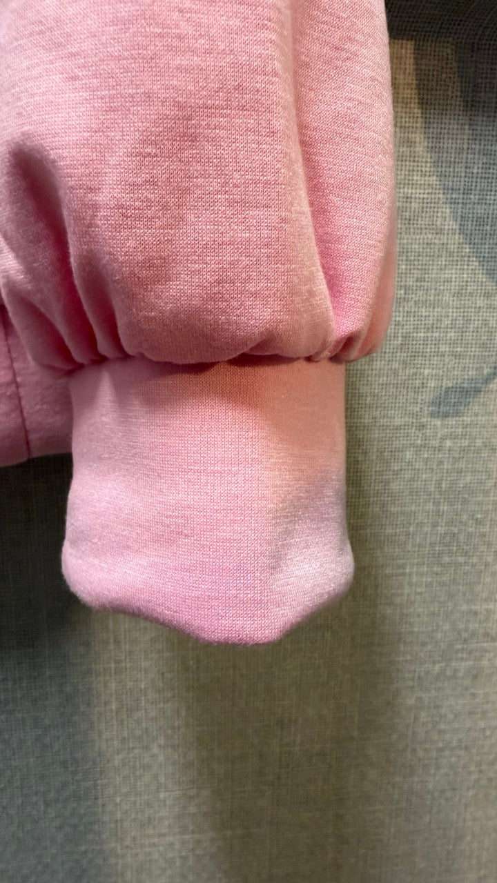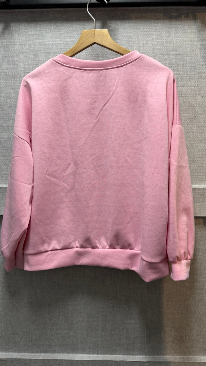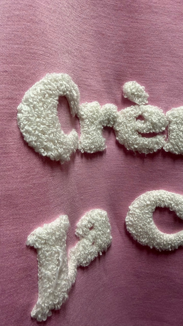 Rosa collegetröja med fluffig broderad text som sätter en lekfull ton i garderoben. Den mjuka blankningen av viskos, polyester och elastan känns härligt bekväm mot huden.